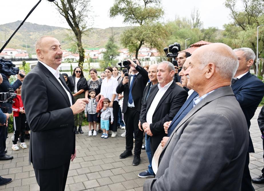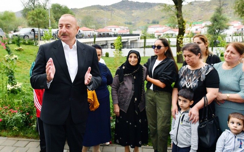 Prezident İlham Əliyev: Siz dünən gəlmisiniz, birinci köçənlərdənsiniz. 31 ildən sonra artıq vətəndaşlarımız öz dədə-baba torpaqlarına qayıdırlar. Bundan böyük xoşbəxtlik ola bilməz. Əminəm ki, siz də hər zaman inanırdınız ki, bu gün gələcək.