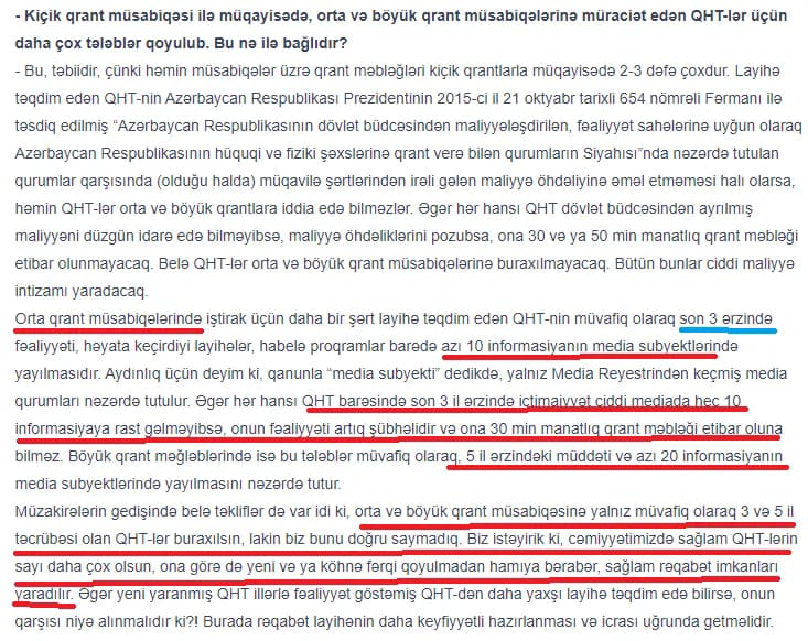 1. Müsahidədə deyilir ki, orta qrantlar üçün QHT-nin müvafiq olaraq son 3 il ərzində fəaliyyəti, layihələri və proqramları barədə ciddi media subyektində 10 informasiya, böyük qrantlarda isə 5 il ərzində müvafiq olaraq 20 informasiyanın yayılması tələb olunur.