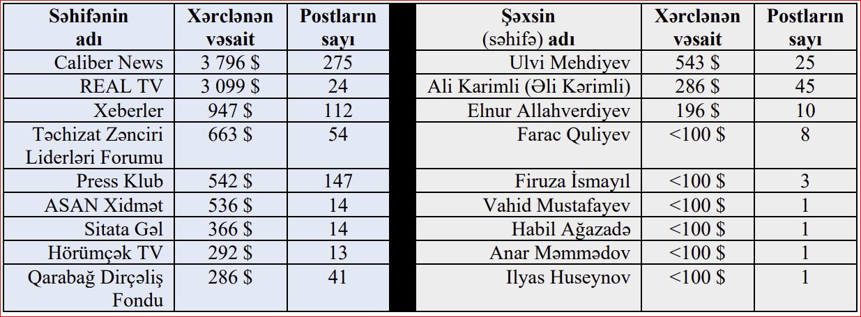 "Azərbaycanda Facebook-da ən çox pul xərcləyən şəxs “ASAN Xidmət”in rəhbəri Ülvi Mehdiyevdir. Son 90 gündə sosial və siyasi məzmunlu 25 postun reklamı üçün 543 dollar xərcləyib (bir post üçün ortalama 22 dollar)".