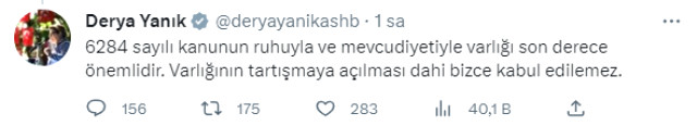Türkiyə Ailə və Sosial Xidmətlər naziri Derya Yanık Fatih Ərbakanın müavinin sözlərinin qəbuleidlməz olduğunu deyib. O, Tvitter hesabında paylaşım edərək yazıb ki, 6284 saylı qanun qadınların qorunması baxımından mühüm əhəmiyyət daşıyır: "Bu qanunun varlığının müzakirəyə açıq olması belə, bizim üçün qəbuledilməzdir".