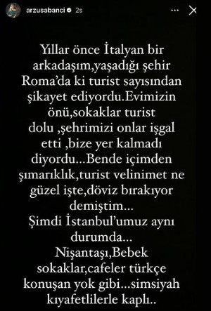 Türkiyədəki məşhur Sabançı ailəsinin üzvü olan Arzu Sabancı sosial media hesabında İstanbula gələn turistlərin bolluğuna etiraz edib.