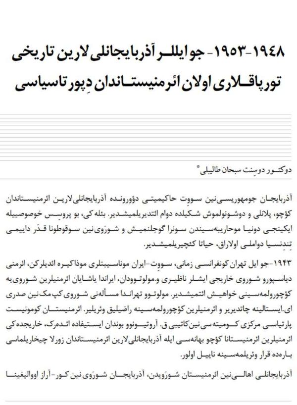 AMEA-nın akademik Ziya Bünyadov adına Şərqşünaslıq İnstitutunun aparıcı elmi işçisi, tarix üzrə fəlsəfə doktoru, dosent Sübhan Talıblının “1948-1953-cü illərdə azərbaycanlıların tarixi torpaqları olan Ermənistandan deportasiyası” adlı məqaləsi Təbrizdə “Aydın gələcək” jurnalında dərc olunub.