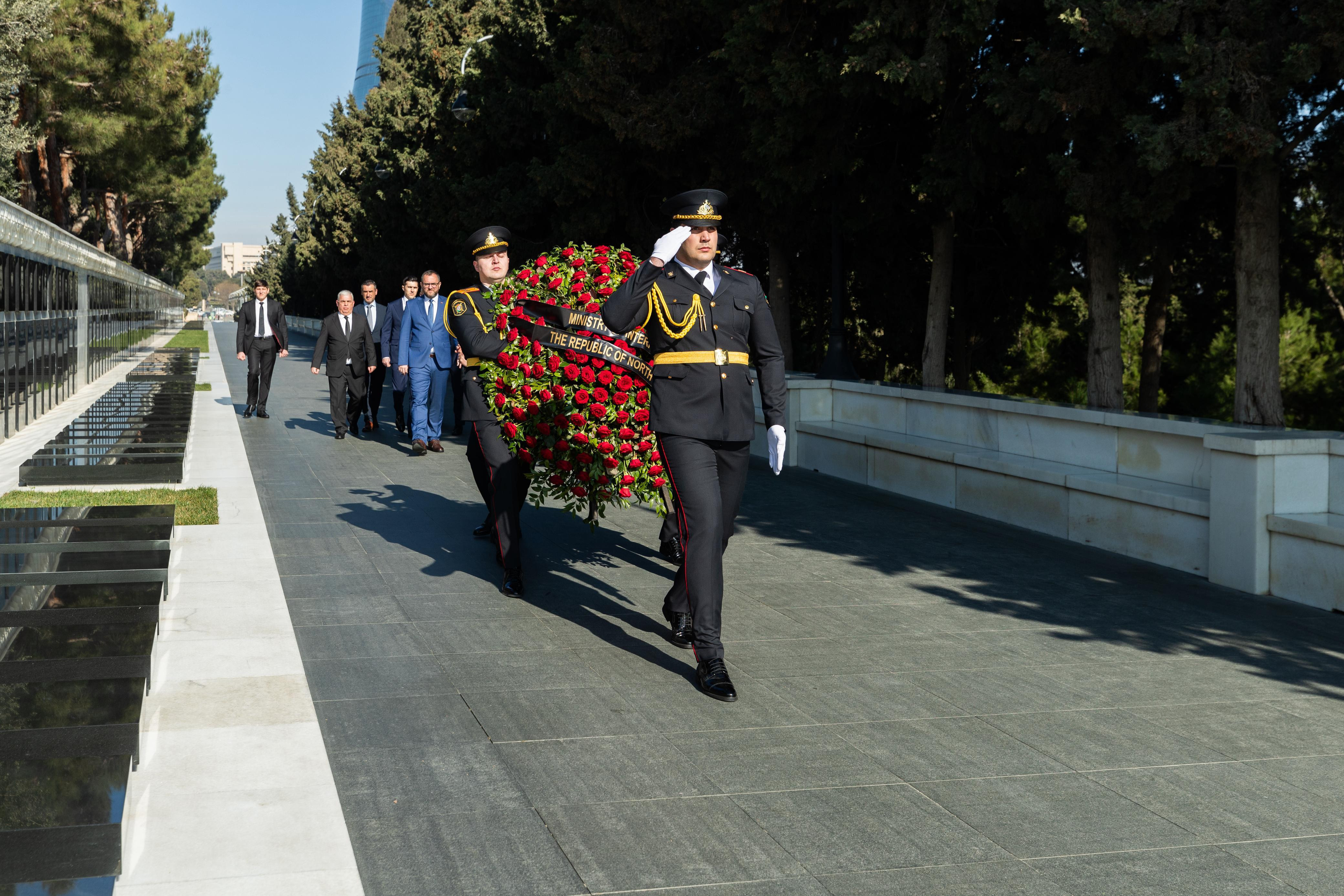 Mia.az DİN-ə istinadən xəbər verir ki, nazir Pançe Toşkovski və onu müşayiət edən şəxslər Fəxri xiyabanda Ümummilli lideri Heydər Əliyevin məzarını və Şəhidlər xiyabanını ziyarət ediblər. “Əbədi məşəl” abidəsinin önünə əklil qoyulub.