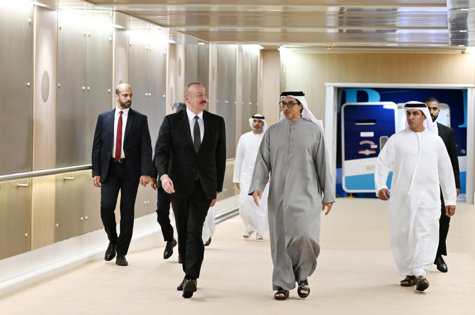 Prezident İlham Əliyevi Birləşmiş Ərəb Əmirliklərinin vitse-prezidenti, Baş nazirin müavini, Prezident Divanının rəhbəri Şeyx Mansur bin Zayed Əl Nəhyan və digər rəsmi şəxslər qarşıladılar.