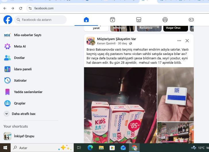 Onun şikayətini təqdim edirik: "Bakıxanovda vaxtı keçmiş məhsulları endirim adıyla satırlar. Vaxtı keçmiş uşaq diş pastasını hansı vicdan sahibi satışda saxlaya bilər axı? Bir neçə dəfə burada səlahiyyətli şəxsə bildirsəm də, xeyri yoxdur, eyni hal davam edir. Bu gün 28 apreldir, məhsul vaxtı 17 apreldə bitib".