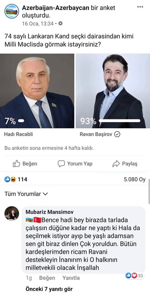 O sorğuya şərh yazaraq Hadi Rəcəbliyə tarlada işləməyi məsləhət görüb: “Məncə Hadi bəy bir az tarlada işləsin, bugünə qədər nə edib ki, yenə də seçilmək istəyir? Ayıbdır, yaşlı adamsan, get, bir az dincəl”.