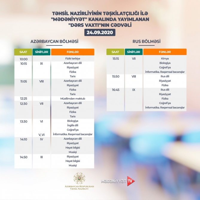 “Mədəniyyət”, “ARB Günəş” telekanalları və “Təhsil” televiziyasının “Facebook” səhifəsində yayımlanan “Dərs vaxtı” proqramının sentyabrın 24-ü üçün nəzərdə tutulan cədvəli açıqlanıb.