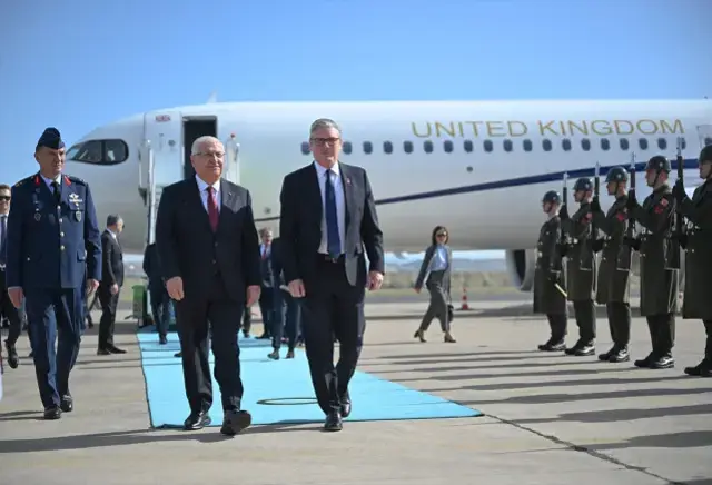 Məlumata görə, Baş naziri Milli Müdafiə Naziri Yaşar Güler Ankarada MÜRTED Aerodrom Komandanlığında qarşılayıb: "Starmerə Britaniya Müdafiə naziri Con Heli və Britaniya Hərbi Hava Qüvvələrinin rəisi general Harv Smit müşayiət edirlər".
